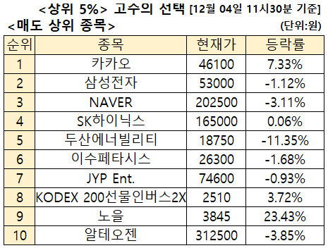 매도는 카카오(035720), 삼성전자(005930), NAVER(035420), SK하이닉스(000660), 두산에너빌리티(034020), 이수페타시스(007660), JYP Ent.(035900), KODEX 200선물인버스2X(252670), 노을(376930), 알테오젠(196170) 순으로 많았습니다.